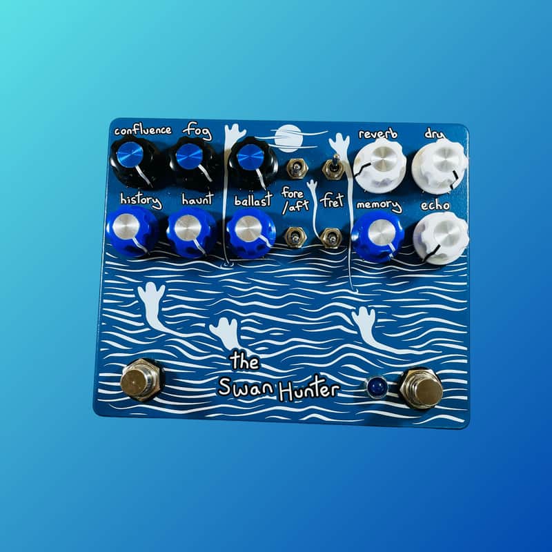 The Champion Leccy Swan Hunter is a lo-fi echo and reverb pedal that combines two of their other pedals’ components: the PT2399 delay chip from the Woozy and the Belton brick reverb from the Skitter. It is designed for creating atmospheric, warped, and gritty sounds, but can also be used for more subtle, clean delay and reverb tones. Key features include separate controls for echo and reverb, a “Confluence” knob to switch between series and parallel signal paths, and a “Fog” control for reverb oscillation