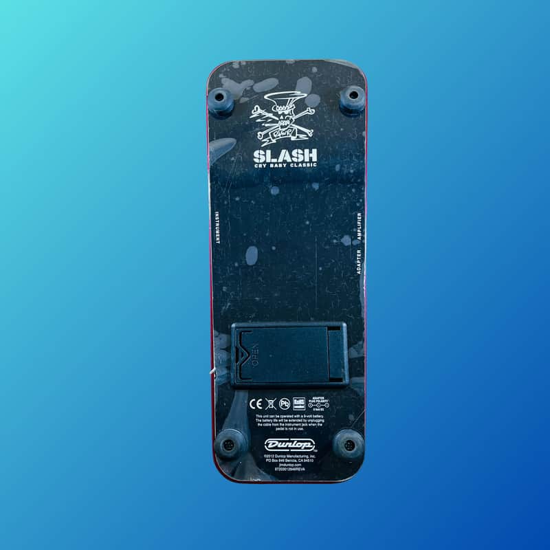 The Dunlop SC95R Slash Signature Cry Baby Classic Wah is designed for a raw, expressive, and thick tone, featuring a custom-wound resonance inductor and a lower frequency tuning for a wide, vocal-like sweep. It includes bright blue, side-mounted on/off LEDs and a durable, distressed hot-rod finish.