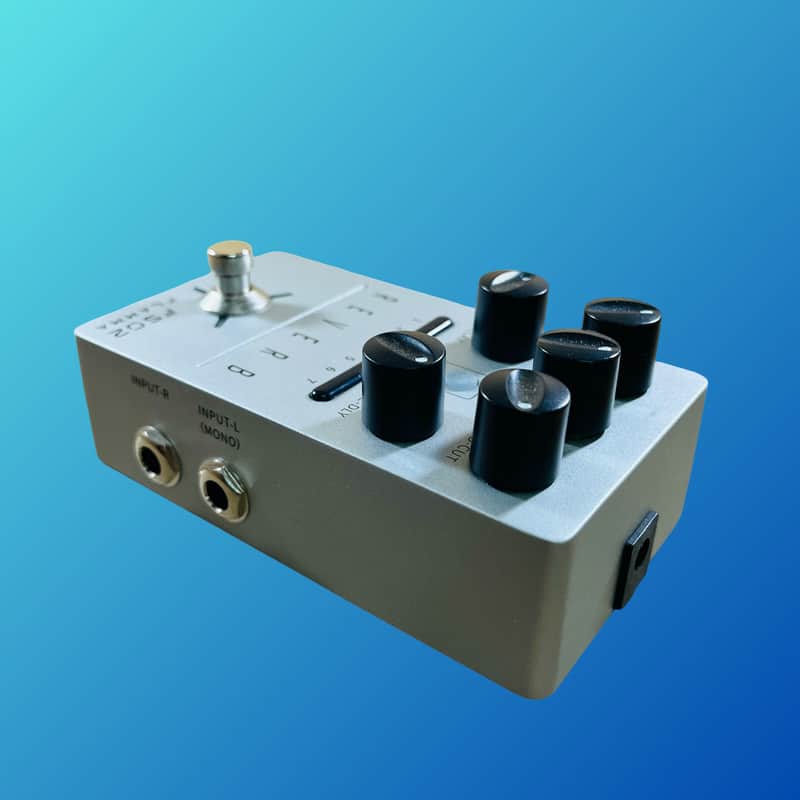 This compact reverb pedal crams seven distinct digital reverb effects in to a sturdy, metal shell and several control features. The various reverb effects aim to simulate different environments from a small room to large, open cave. More niche effects are also included such as studio-style plate reverb, classic spring reverb effect, and the more far-out modulation reverb effect. Each effect can be modified with the Hi-Cut, Lo-Cut, Decay, and Pre-Delay knobs and then saved to their own save slot. An effect trail feature can be toggled on and off to have each effect fade out naturally after being switched off.