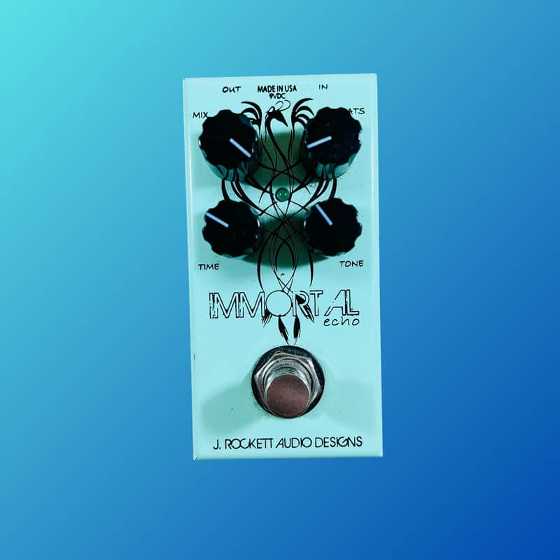From wet, percussive echoes to long, plaintive repeats, the J. Rockett Immortal Echo — part of the Jet Series — gives you up to 680ms of delicious analog-flavored slapback and delay in a pedalboard-friendly enclosure. Dedicated Repeat, Time, and Tone controls allow you to quickly dial in how long, lingering, and present your wet signal is. So whether you’re building atmosphere with howling feedback or texturizing with dark, degenerating tape repeats, the Immortal Echo is streamlined and responsive to the touch. A Blend control balances your wet and dry signals to conjure ghostly echoes to prominent eighth-note chased-delay effects. True bypass switching and a low current draw (just 26mA) minimize the Immortal Echo’s footprint on your tone and board.