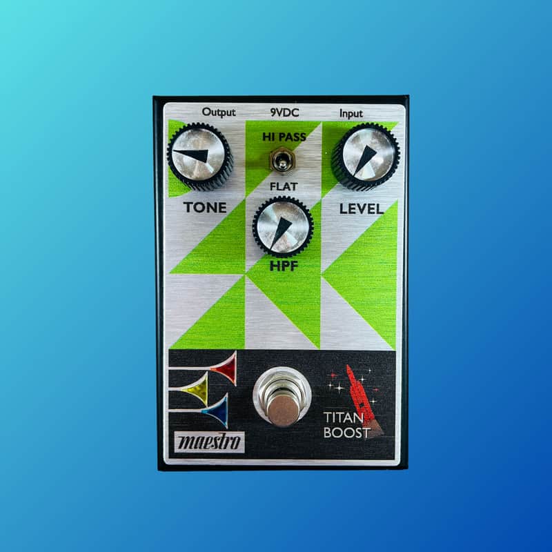 Capable of producing up to 25 decibels of clean analog gain, Maestro’s Titan Boost pedal brings a simple, custom solution to maximizing your audio signal’s output. A Flat and Hi Pass toggle switch allows you to instantly cut the muddiness out of your mix, and it’s fully adjustable via the front panel’s HPF knob. Finally, with its true bypass footswitch and Tone and Level controls, the Titan Boost makes cleaning up your sound a painless and personable process on any pedalboard.