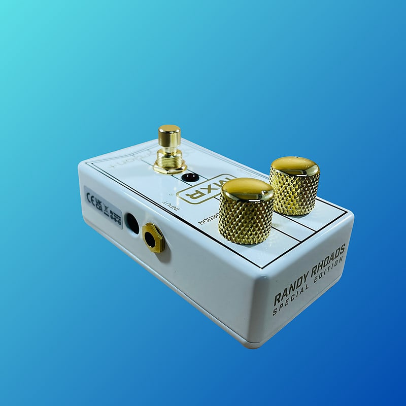 The MXR RR104C Randy Rhoads Signature Special Edition Distortion+ is a meticulously crafted pedal designed to replicate the signature tone of the legendary guitarist. Its clean white and pinstripe gold finish is inspired by Rhoads’ famous V-style guitar.